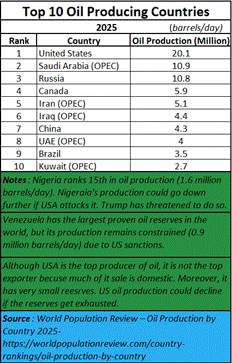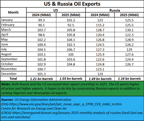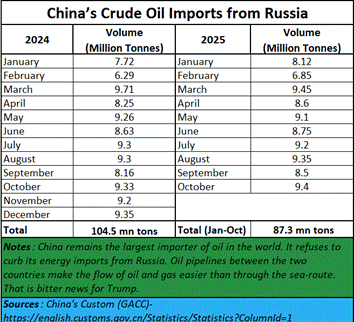 President Donald J Trump is having a field day. He has succeeded in tripping up Venezuela. In spite of having the world’s largest reserves of oil, Venezuela’s production and exports have been curtailed to a trickle (https://www.bbc.com/news/articles/c62zzv02r3vo). Trump is threatening Nigeria (https://www.aljazeera.com/news/2025/11/1/trump-threatens-to-launch-attacks-in-nigeria-over-killing-of-christians), another large producer of oil. Each of these countries will slip on the oil slick Trump himself has created. It is now India’s turn to slip on this oily slope. Unless Russia succeeds in finding a way for India to deal with the rapidly developing economic situation globally.