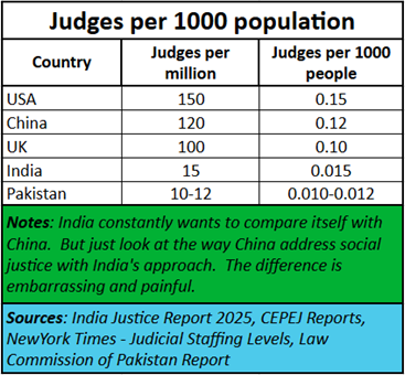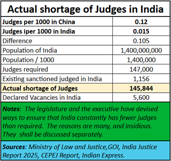 But there is a third, more insidious way to make the judiciary corrupt and ineffective. This is by ensuring that fewer judiciary posts are sanctioned than are required for a country as large as India. Consider for instance, how China, our next-door neighbour has 0.12 judges per 1000 people while India has only 0.015 judges per thousand people. That means the sanctioned number of judges is short by 1,45,844 judicial posts. This creates shortages, which in turn causes the number of pending cases to increase. That, in turn, allows the powerful to delay the hearing of their cases.