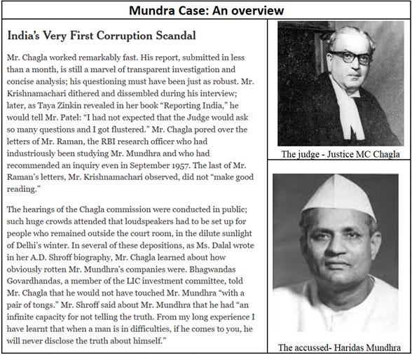 · The case involved the Prime Minister, Finance Minister, the LIC chairman, the Reserve Bank of India (RBI) governor in addition to the scamster Haridas Mundhra (https://archive.nytimes.com/india.blogs.nytimes.com/2012/05/09/long-view-indias-very-first-corruption-scandal/).