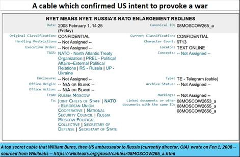On 1 February 2008, William Burns (then US ambassador to Russia, and currently director of CIA) sent a highly classified cable to his government telling it “Nyet means Nyet” (https://wikileaks.org/plusd/cables/08MOSCOW265_a.html). It warned the US government not to allow NATO to move eastwards and provoke Russia. He warned that it would lead to a war. The cable was eventually made public by Wikileaks. It then was later picked up by Robert Wade who wrote about it in Le Monde on 15 March 2015 (https://eprints.lse.ac.uk/61428/1/Wade_Ukraine_crisis_is_not_what%20it_seems.pdf). The document confirms the West’s complicity.