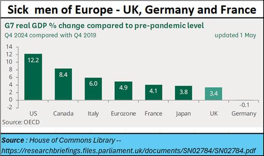 Consider a chart from a report dated 1 May 2025, by the UK House of Commons Library (https://researchbriefings.files.parliament.uk/documents/SN02784/SN02784.pdf). It shows, quite starkly, that Germany, the UK, and France, are all terribly weak compared to the G-7. In fact, many economists call them the sick men of Europe. There was a time when Germany was the powerhouse of Europe. Not so anymore.