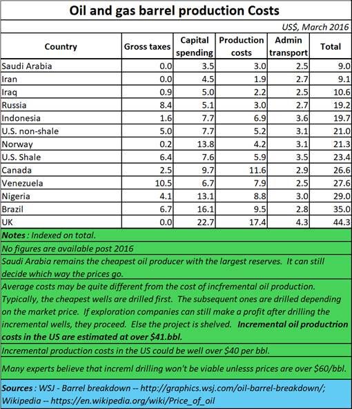 Some experts believe that at this planned price of under $50/bbl, one-third of existing oil producers in the US could shut shop because operations would then not be viable anymore. US would lose production. This is because even as things stand today, the cost of incremental oil production is around $41 / bbl. See timeline 9:38 at
